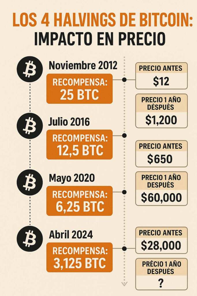 👉 Cada halving hace que entren menos bitcoins al mercado, lo cual reduce la oferta. Si la demanda se mantiene o aumenta, esto puede provocar una subida de precio.