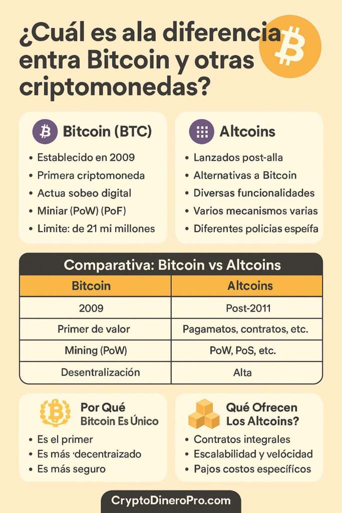 Cuando se habla de criptomonedas, el primer nombre que viene a la mente es Bitcoin (BTC). Sin embargo, existen miles de otras criptomonedas que se han desarrollado después, conocidas como altcoins. Pero, ¿qué hace diferente a Bitcoin de todas las demás? ¿Por qué sigue siendo tan relevante? ¿Y cómo elegir entre invertir en Bitcoin o en otras criptos?