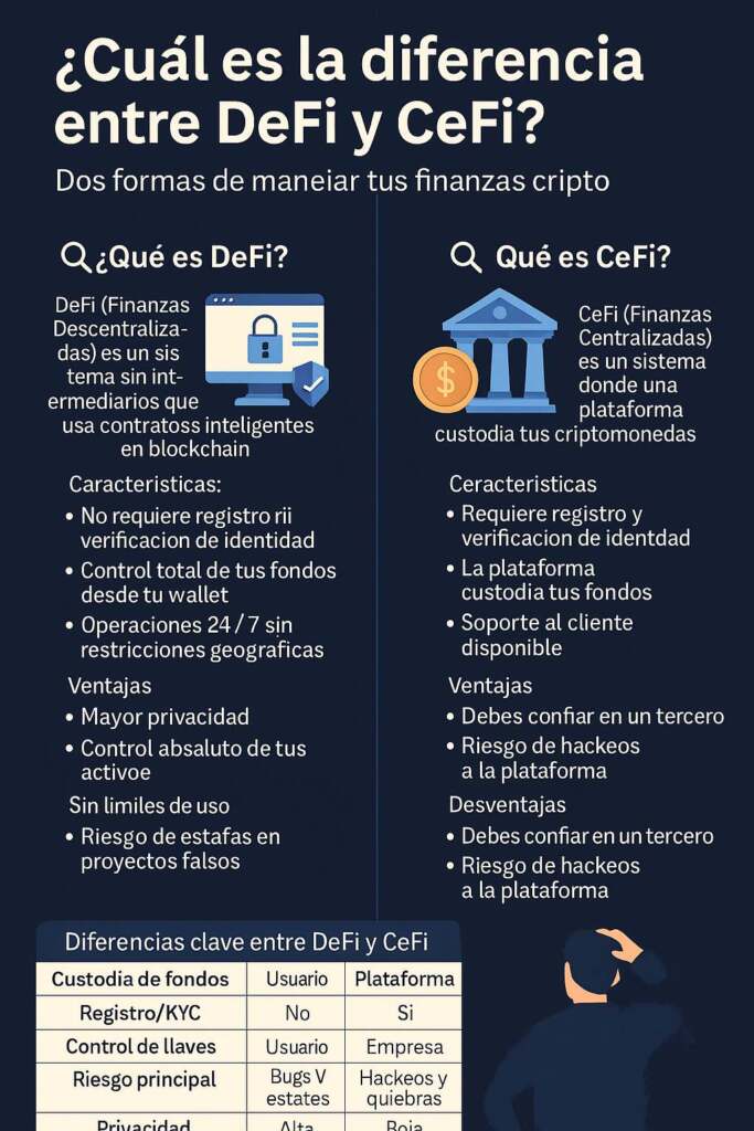 En este artículo descubrirás qué es DeFi, qué es CeFi, sus diferencias, ventajas y riesgos, para que elijas cuál se adapta mejor a ti.