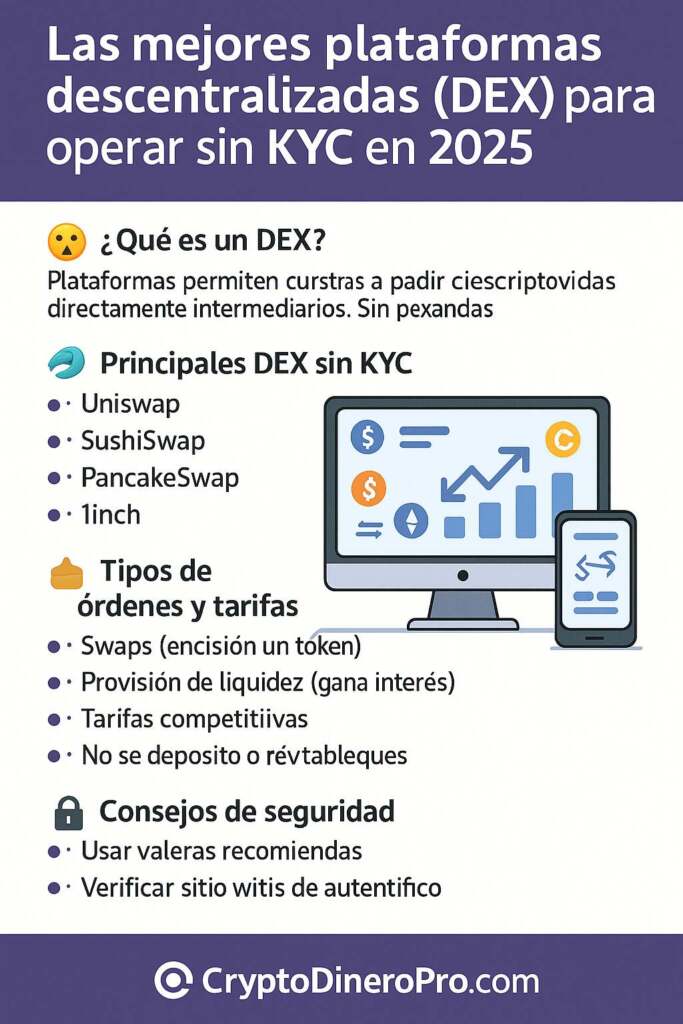 En el mundo de las criptomonedas, mantener la privacidad es una prioridad para muchos usuarios. En 2025, las plataformas descentralizadas (DEX) que permiten operar sin KYC (verificación de identidad) han ganado popularidad por su facilidad de uso, rapidez y anonimato. En esta guía te presentamos las mejores opciones para operar sin dar tus datos personales.