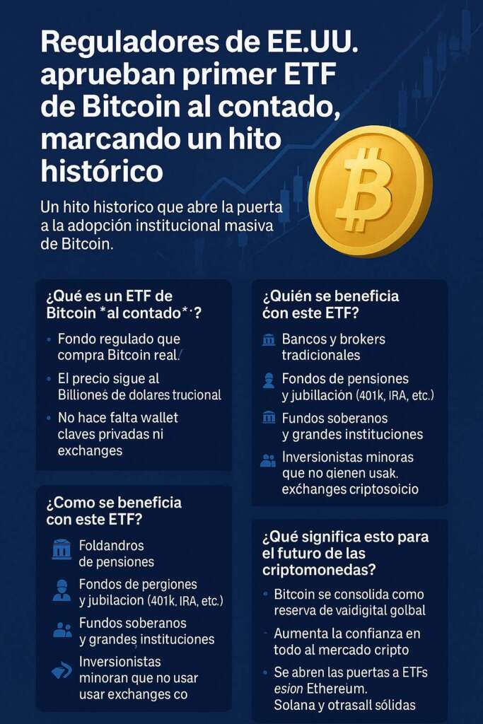 Los reguladores de Estados Unidos finalmente aprobaron el primer ETF de Bitcoin al contado, marcando el paso más significativo en la historia del ecosistema cripto. Esta decisión no solo valida a Bitcoin como un activo financiero legítimo, sino que abre la puerta a billones de dólares institucionales, acelera la adopción mundial, impulsa un cambio estructural en la economía digital y posiciona a BTC como un activo comparable al oro a nivel regulatorio.